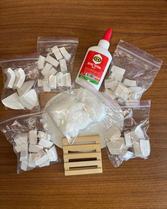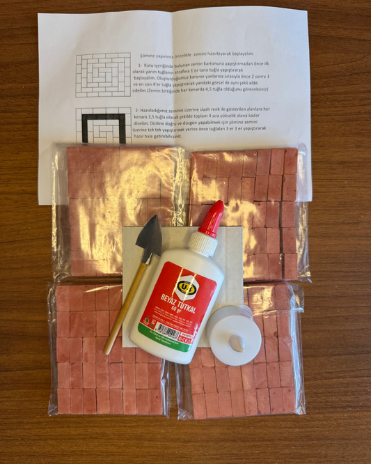 İçinden çıkan tabanlıkların üzerinde önce yapıştırıcı harcı az miktarda suyla karıştırarak çimento elde edip, ardından görseldeki ev modelini ya da kendi hayalinizi tuğlalarla oluşturarak seti inşa edebilirsiniz.